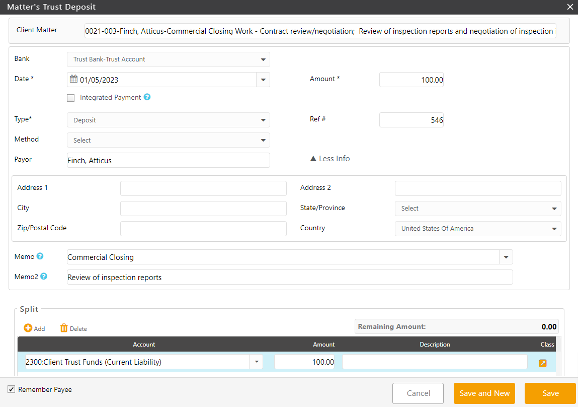 If you clicked Save or Save and New, the system adds the trust deposit transaction and associates it with its designated matter.