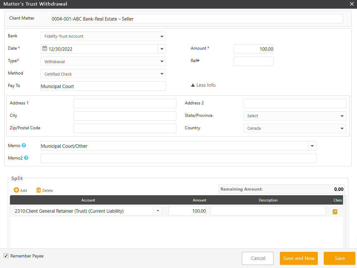 - Click Save and New to save this trust transaction and enter another withdrawal.