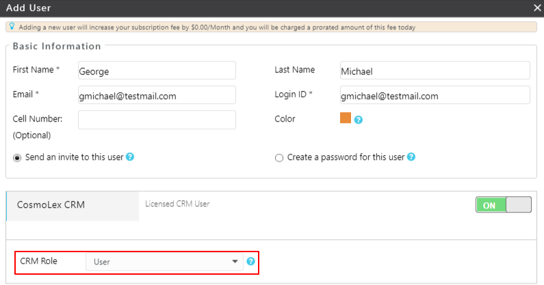 - On the Edit User screen, turn the toggle button beside CosmoLex CRM to ON.