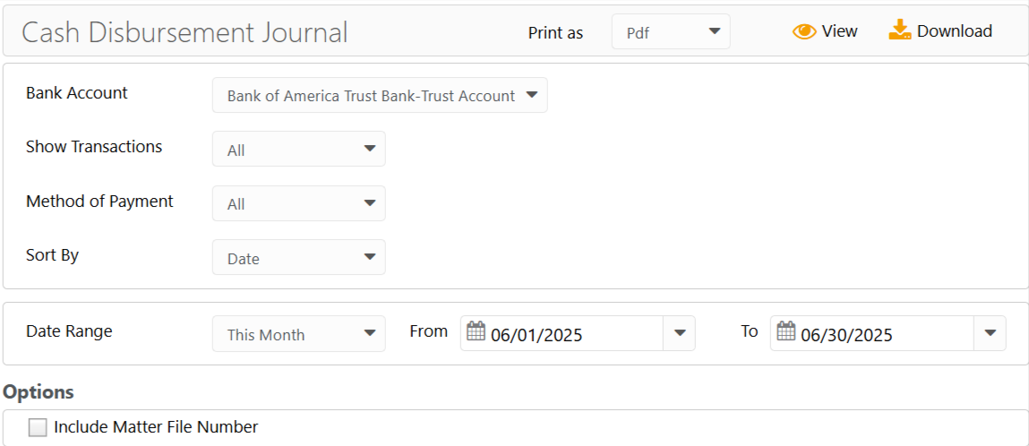 The Cash Disbursements Journal shows payments and other withdrawals from the selected bank accounts within a specified date range.