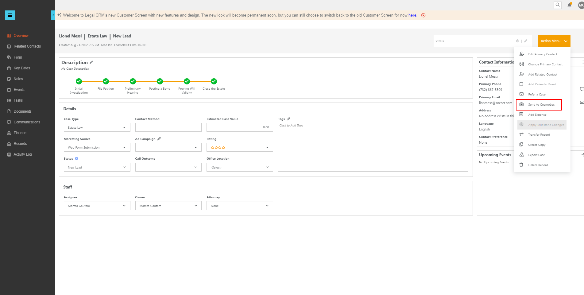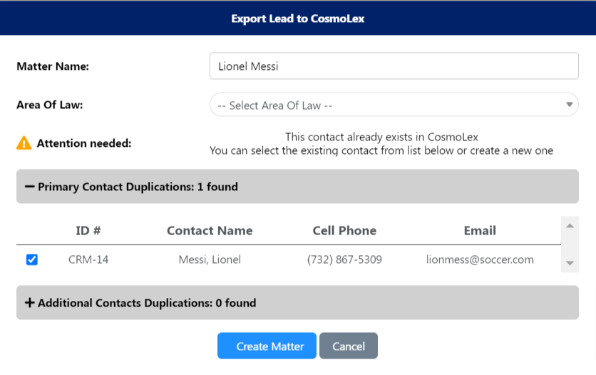 Otherwise, you can ignore the duplicate contact and click Create Matter. - The pop-up prompt asks you “Are you ready to send this lead to CosmoLex?”