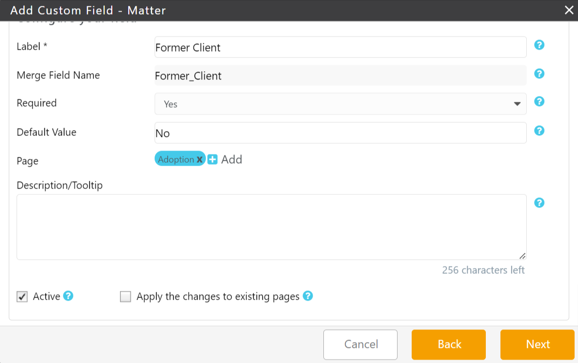 - From the tabs atop Custom Fields screen, click either Matter or Contact.