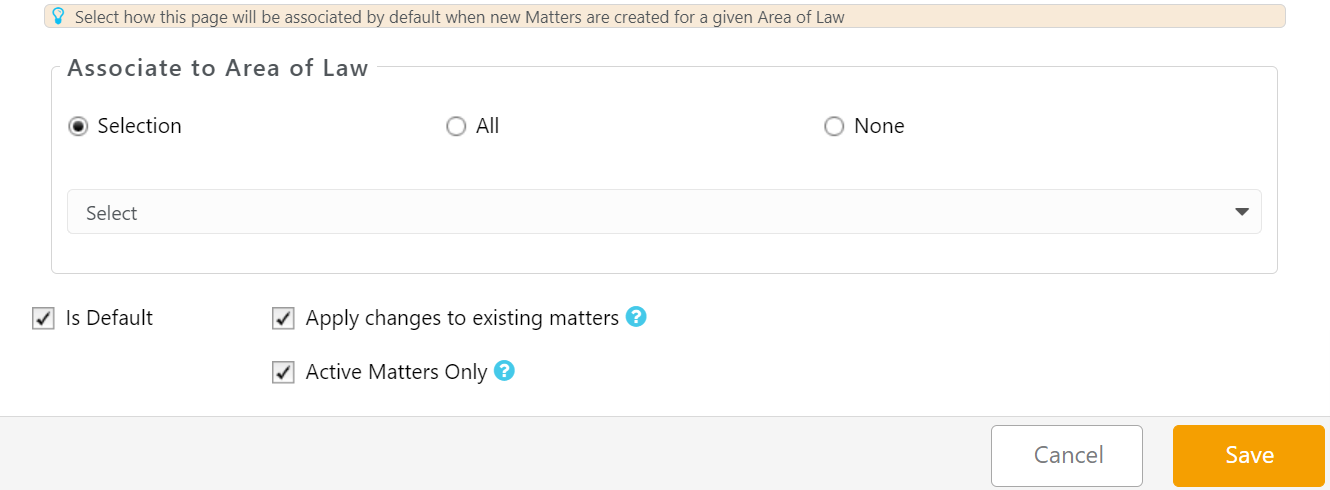 | Apply changes to existing matters | If you check this box, system will assign this newly created page to all the existing matters associated with selected area of law |