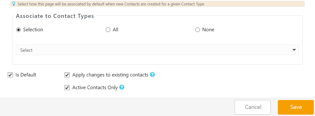 | Selection | Use the drop-down to select one or multiple contact types with which to associate the page. |