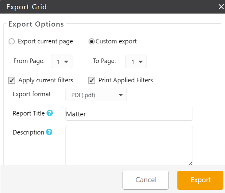 Report Title You can overwrite the default title, if desired. Description Enter a description, if desired. This will display beneath the Report Title. - Export Current Page
