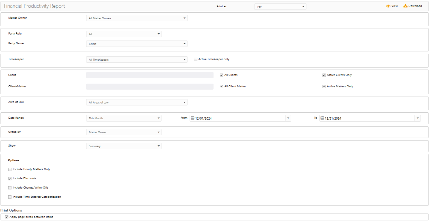 • Group By: You can choose to group by Matter Owner, Timekeeper, Client, Matter, or Area of Law.
