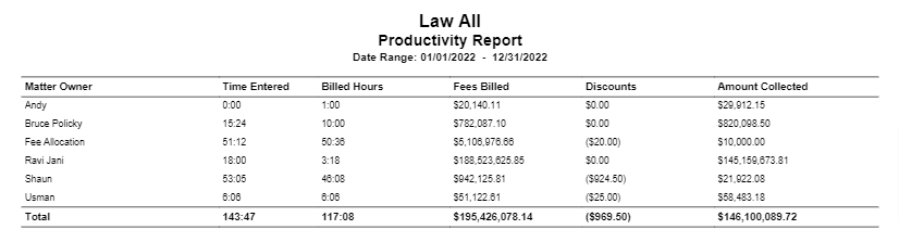 Displays the fees billed, taking only the fees from timecards and no other fees, like Finance Charges or Late Fees.