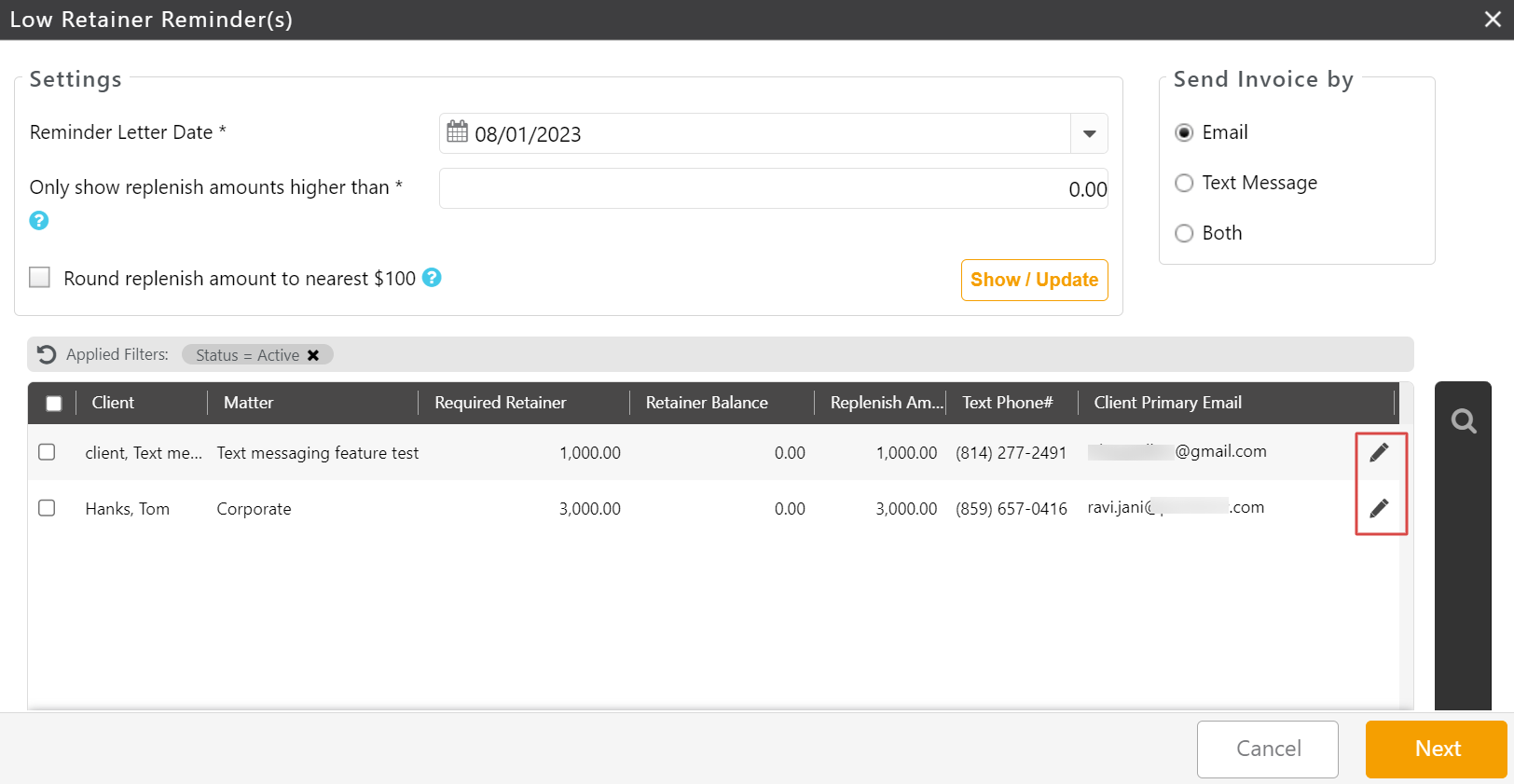 The system flags matters with low retainer requirements once they meet the threshold you have set. You can use this feature to email retainer reminders to all clients at once.
