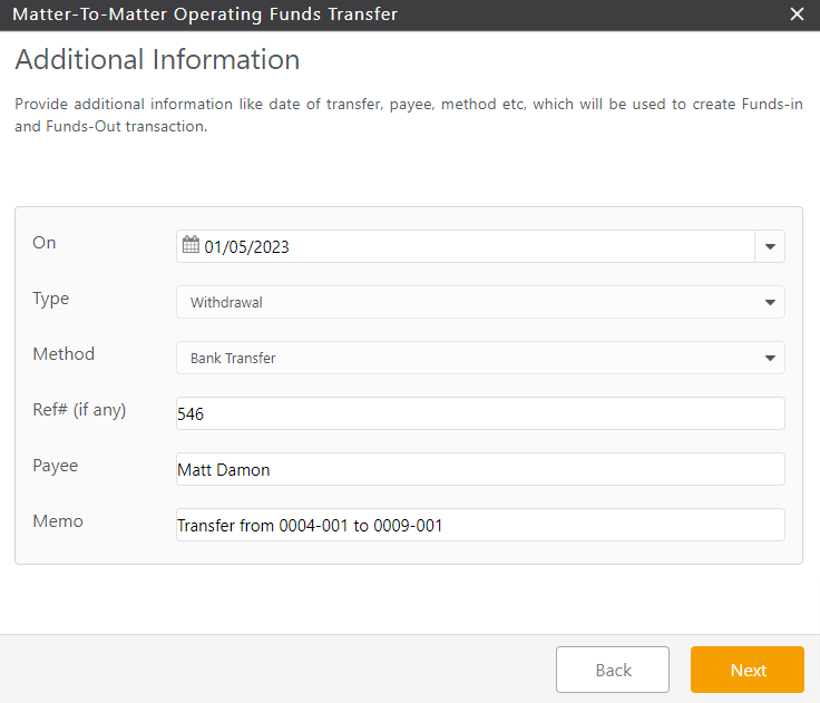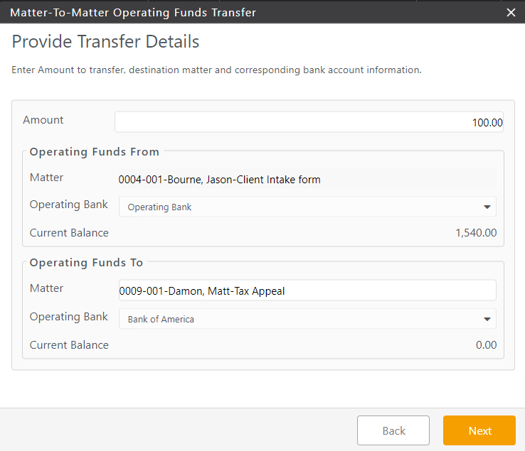 - In the Operating Funds To section’s Matter field, start entering the client or matter name.