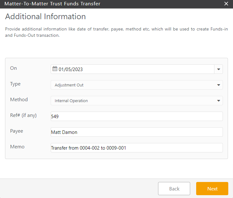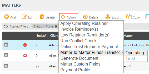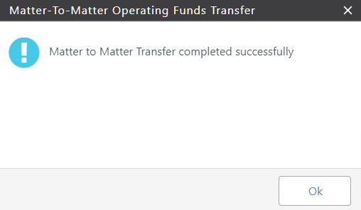 - From the toolbar, click Action > Matter to Matter Funds Transfer.