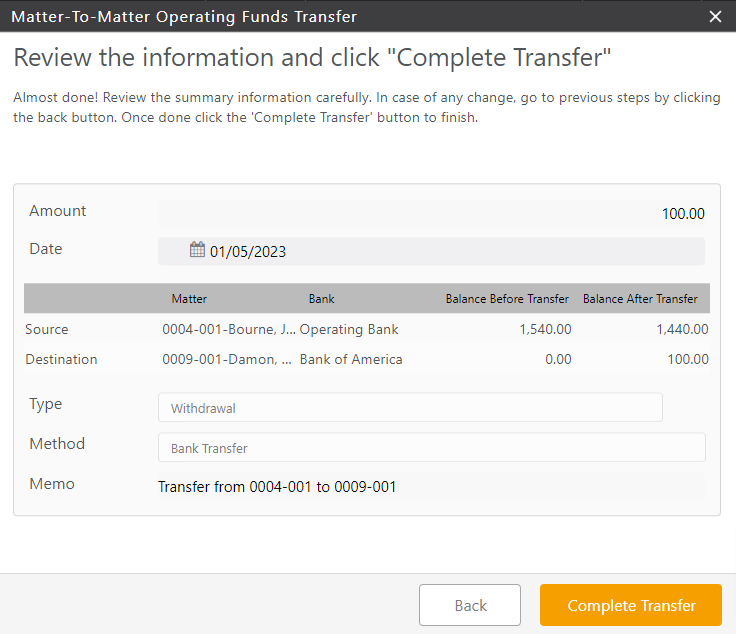 With our matter-to-matter internal transfer tool, you can transfer funds between: