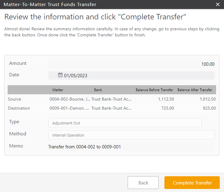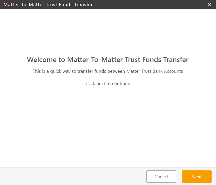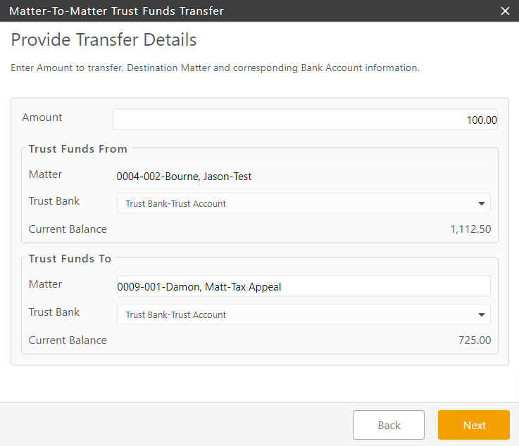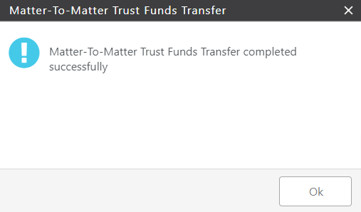 - A Matter to Matter Internal Trust Funds Transfer is a great tool when changing trust banks. Just create a transfer for the same matter and select the appropriate banks. For additional information, see Switching Trust Banks.